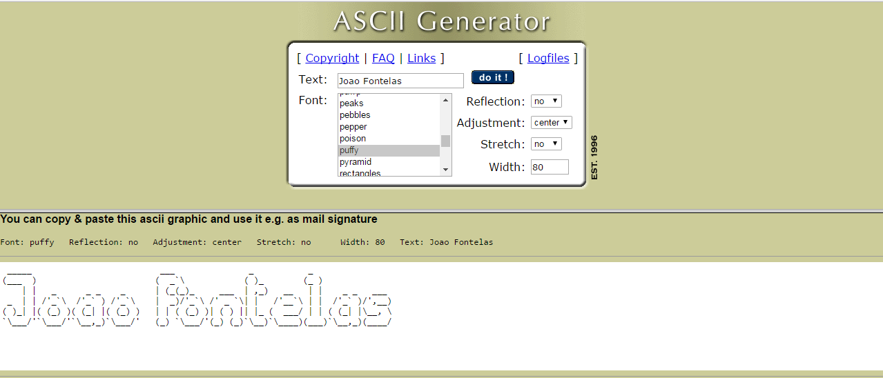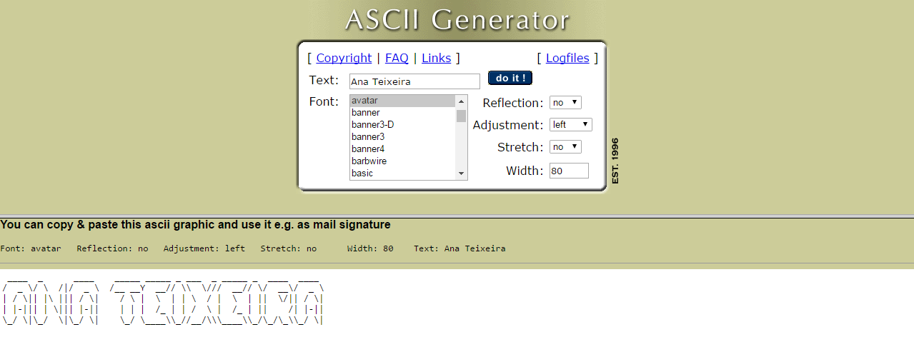 Utilização da ferramenta http://www.glassgiant.com/ascii/: